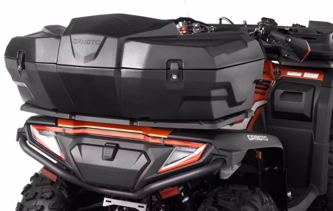 Boxen har tät botten samtidigt som tätningsgummi skyddar innehållet från fukt, smuts och damm under alla slags förhållanden. Förvaringsboxen monteras enkelt med CFMOTO snabbfäste utanpå boxen i befintliga hål i bakracket. Boxen har en stor volym på 90 liter.