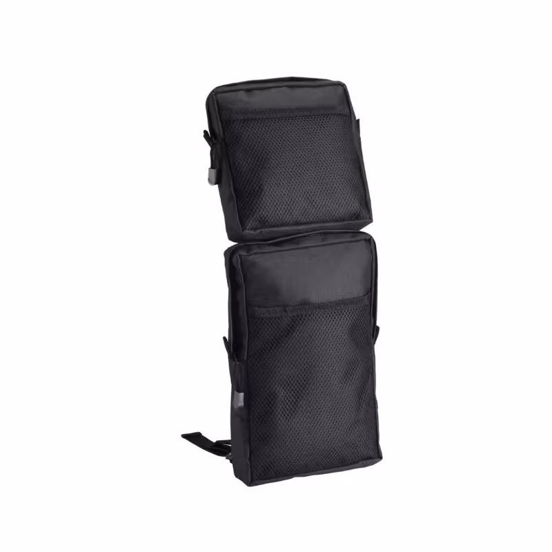 Väskan har 2 fack med dragkedja samt två yttre fack med nät.
